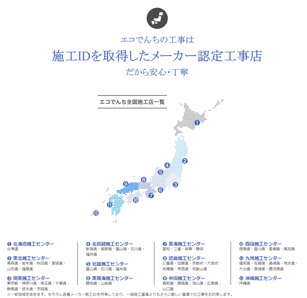 全国の協力施工店で高品質な設置を保証。エコでんちで、もっと安心して太陽光生活を楽しみませんか?