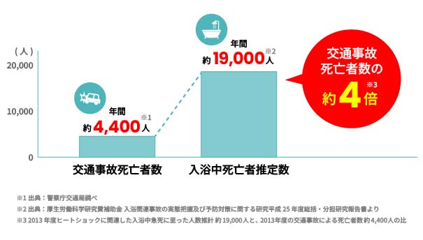日本では年間約19,000人以上がヒートショックに関連して入浴中に亡くなっていると推計されており、これは交通事故死者数の数倍にのぼります。