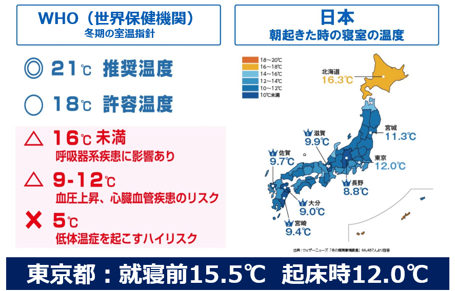 ・WHOが推奨している冬季の家庭内の温度は21℃ですが、東京都の起床時の温度はたった12℃しかありません。