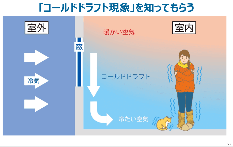 冷たい窓ガラスで急冷された空気が重くなり、滝のように床を這って足元を直撃する現象のことです。